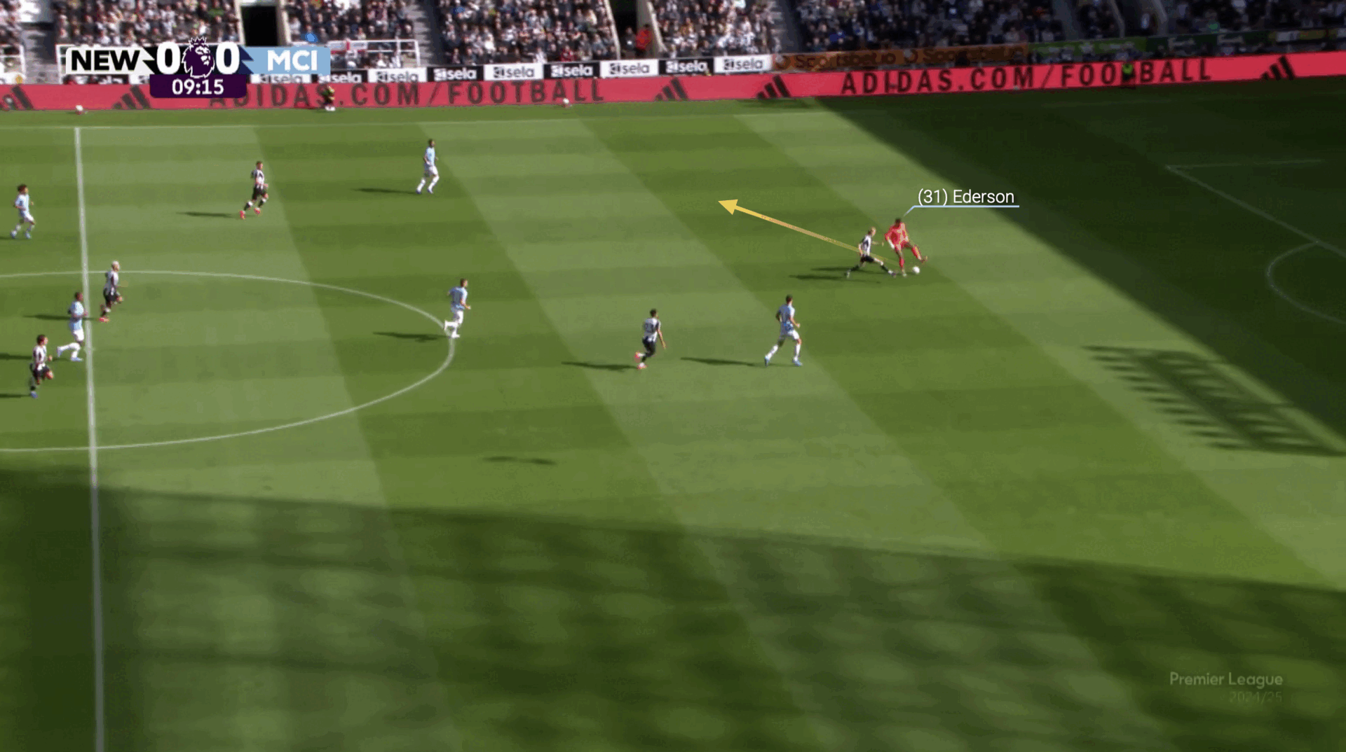 埃德森最具代表性的助攻之一出现在2022年10月对阵布莱顿时,当时德泽尔比的球队试图通过人盯人压迫来逼抢曼城,迫使他们远离球门(如下图第一帧所示)。