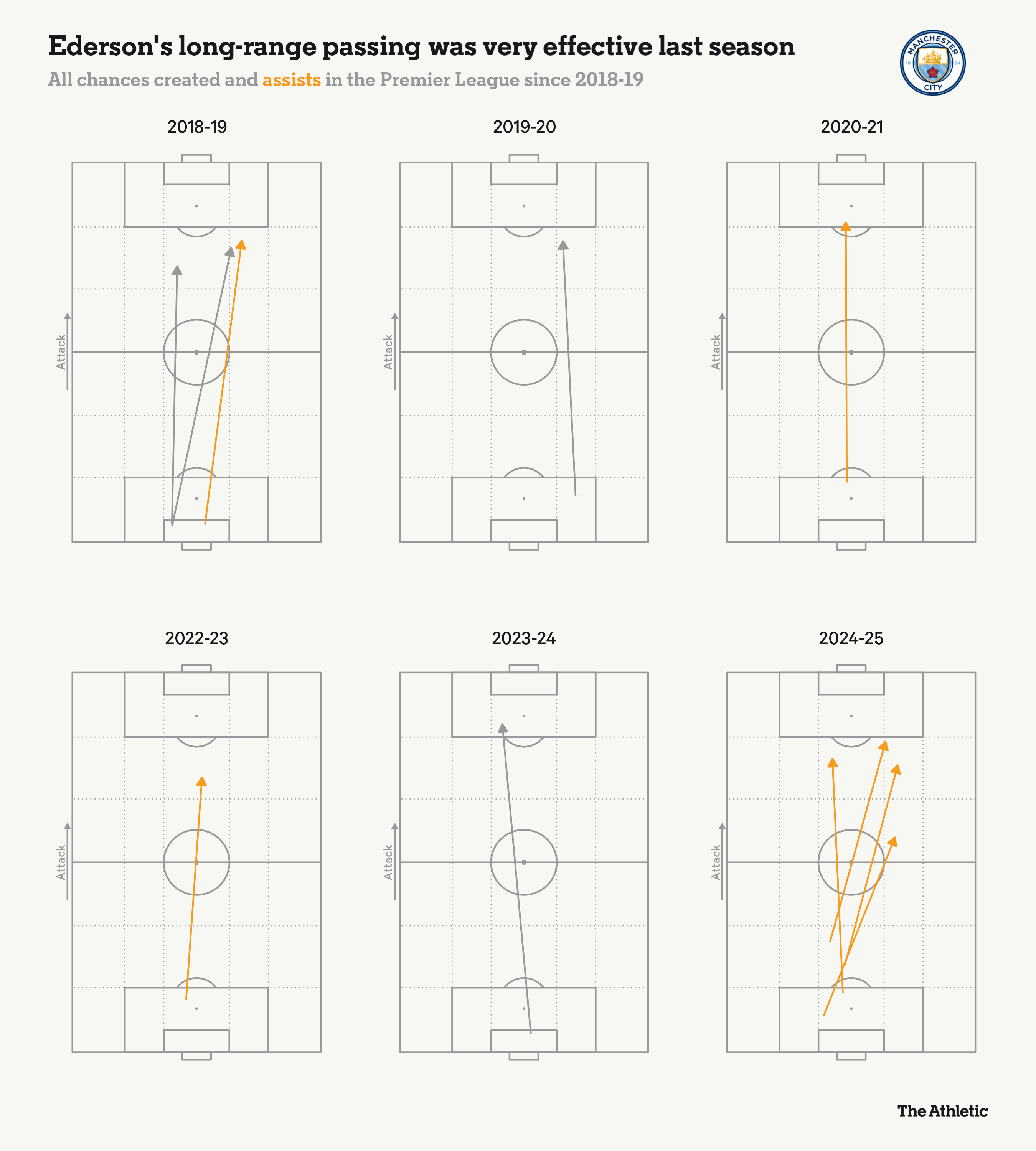 即便在他最艰难的一个赛季中,埃德森依然送出了四次助攻,这一数字超过了除三名门将之外的所有英超门将在整个职业生涯中的助攻总数。